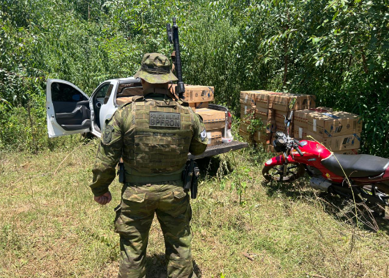 Durante a ação, foram localizados uma motocicleta Honda/CG 125 vermelha e um veículo GM/Montana branco, este último parcialmente carregado com caixas de cigarros, próximo aos veículos, os agentes encontraram outras caixas escondidas sob uma lona, totalizando os 13 mil pacotes de cigarros de origem estrangeira.