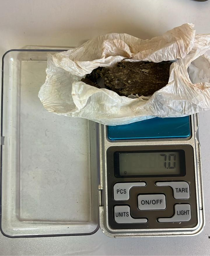 Durante a abordagem e identificação, nada de ilícito foi encontrado em revista pessoal, no entanto, após varredura no local onde o objeto havia sido dispensado, os policiais localizaram um dichavador e uma porção de substância análoga à maconha, embalada em plástico, pesando aproximadamente 7 gramas.